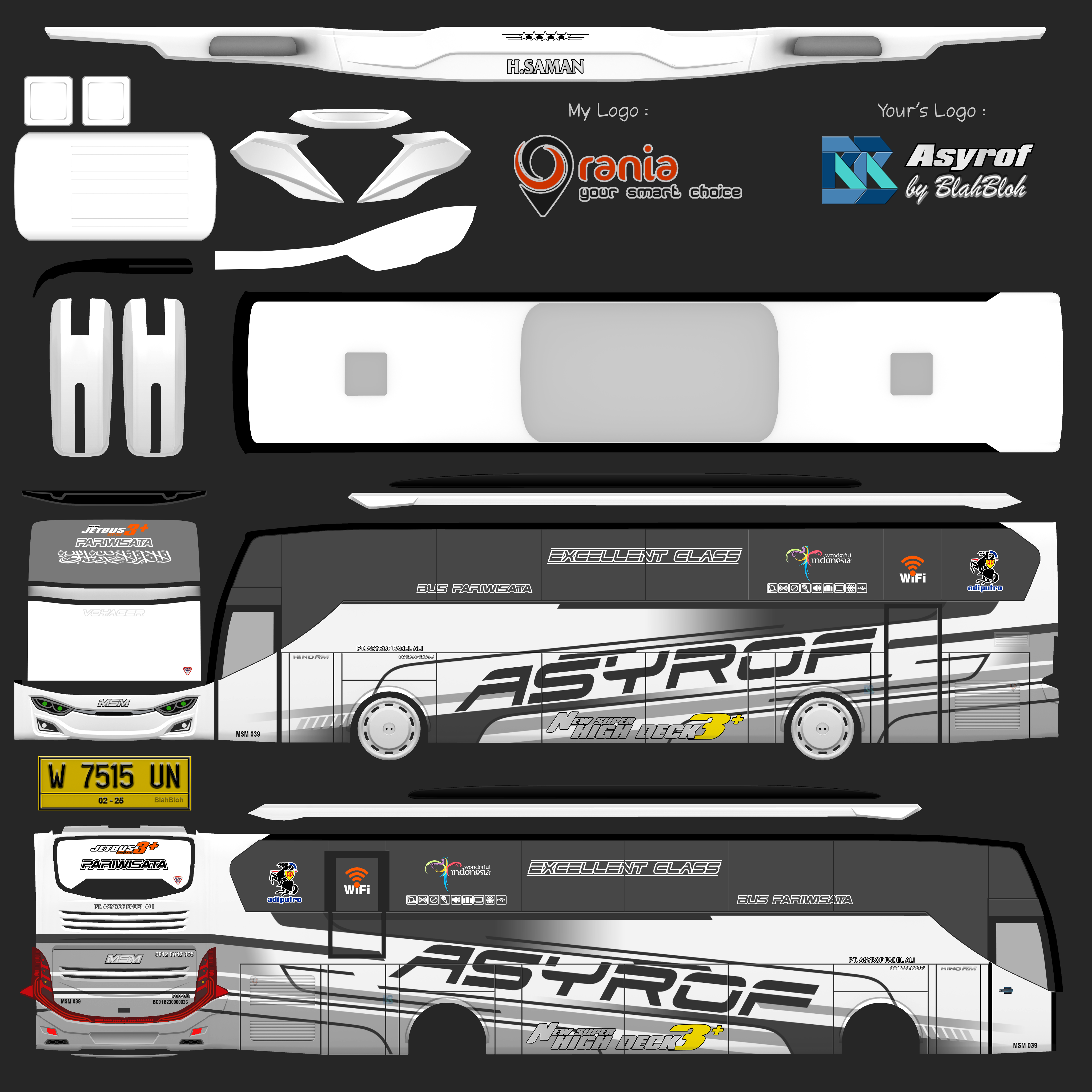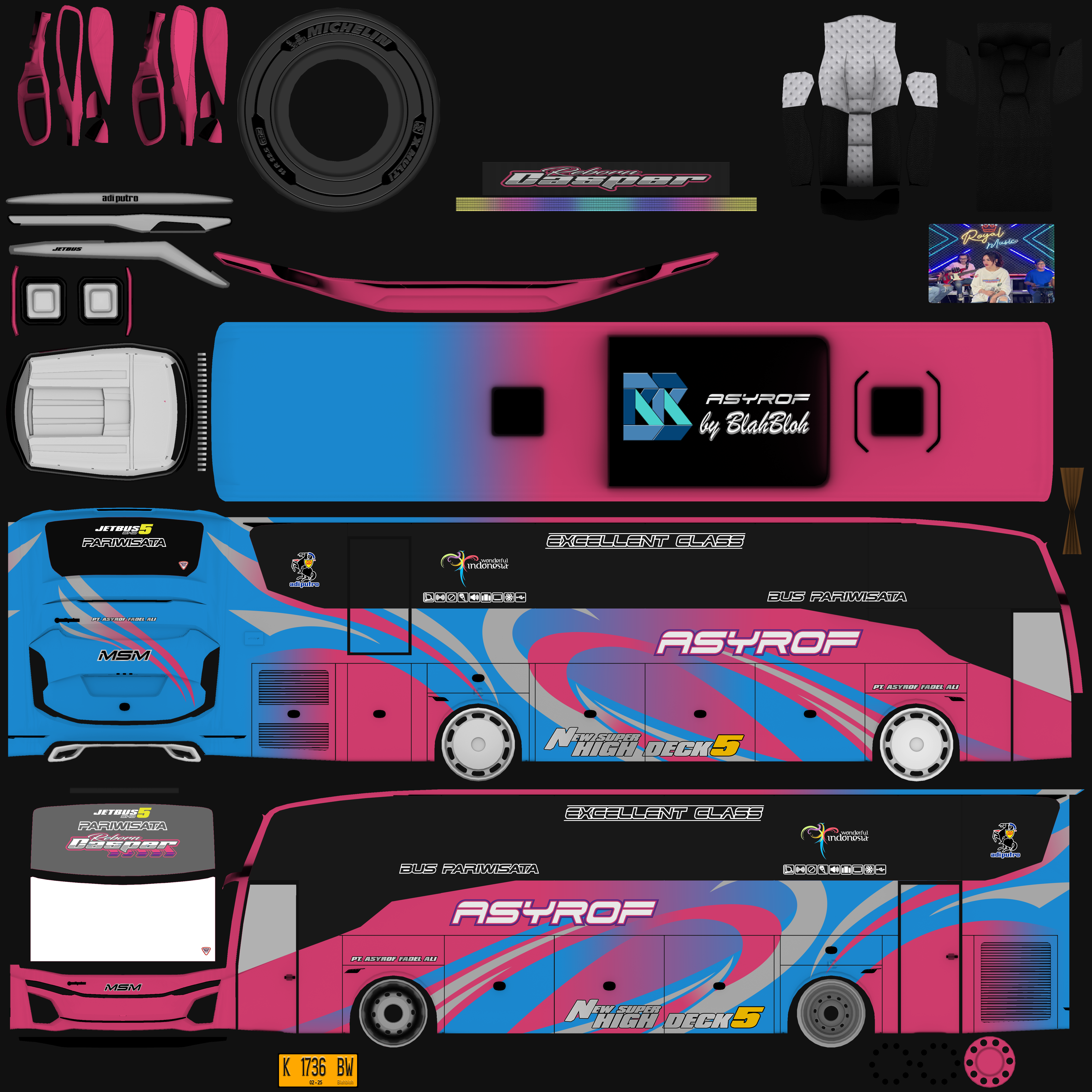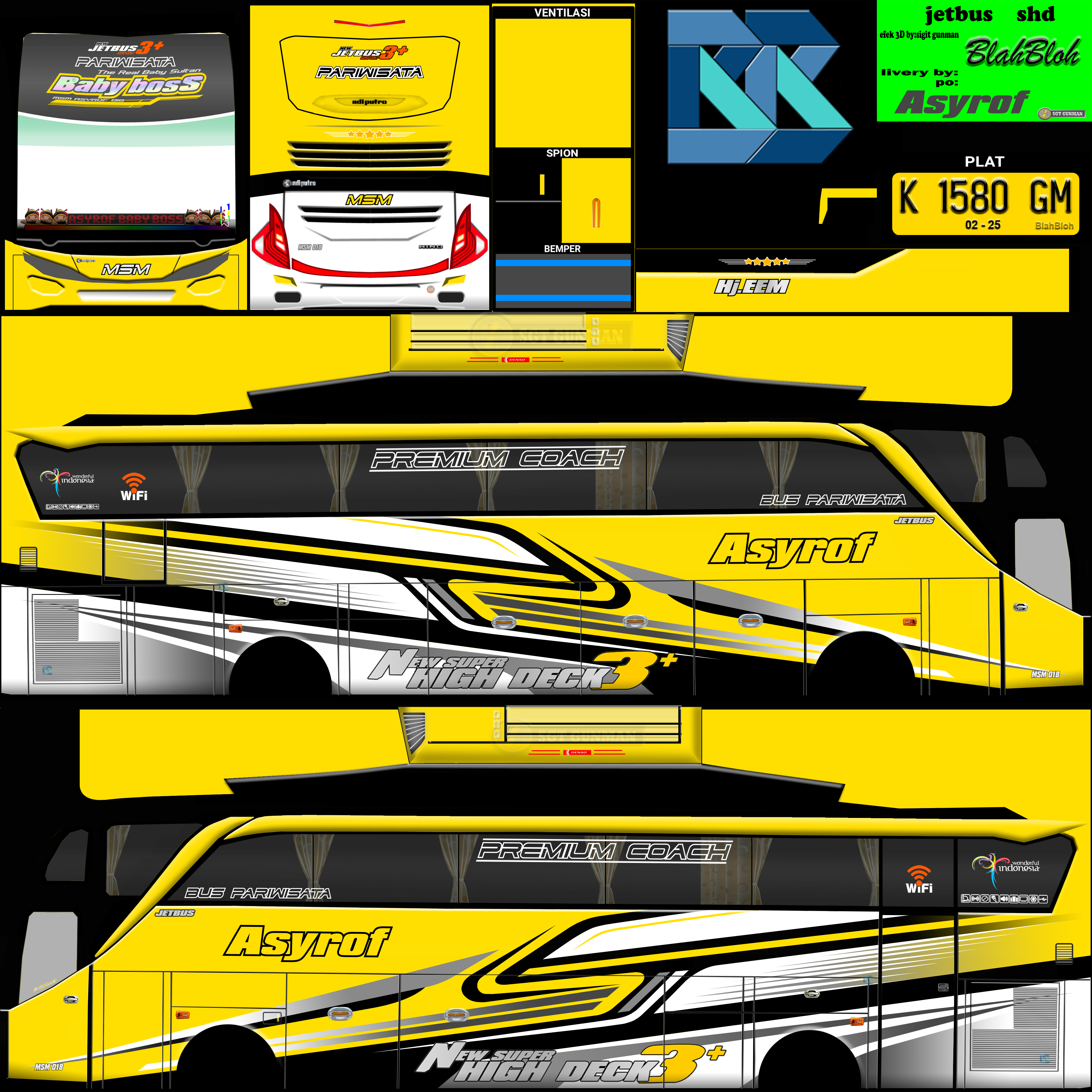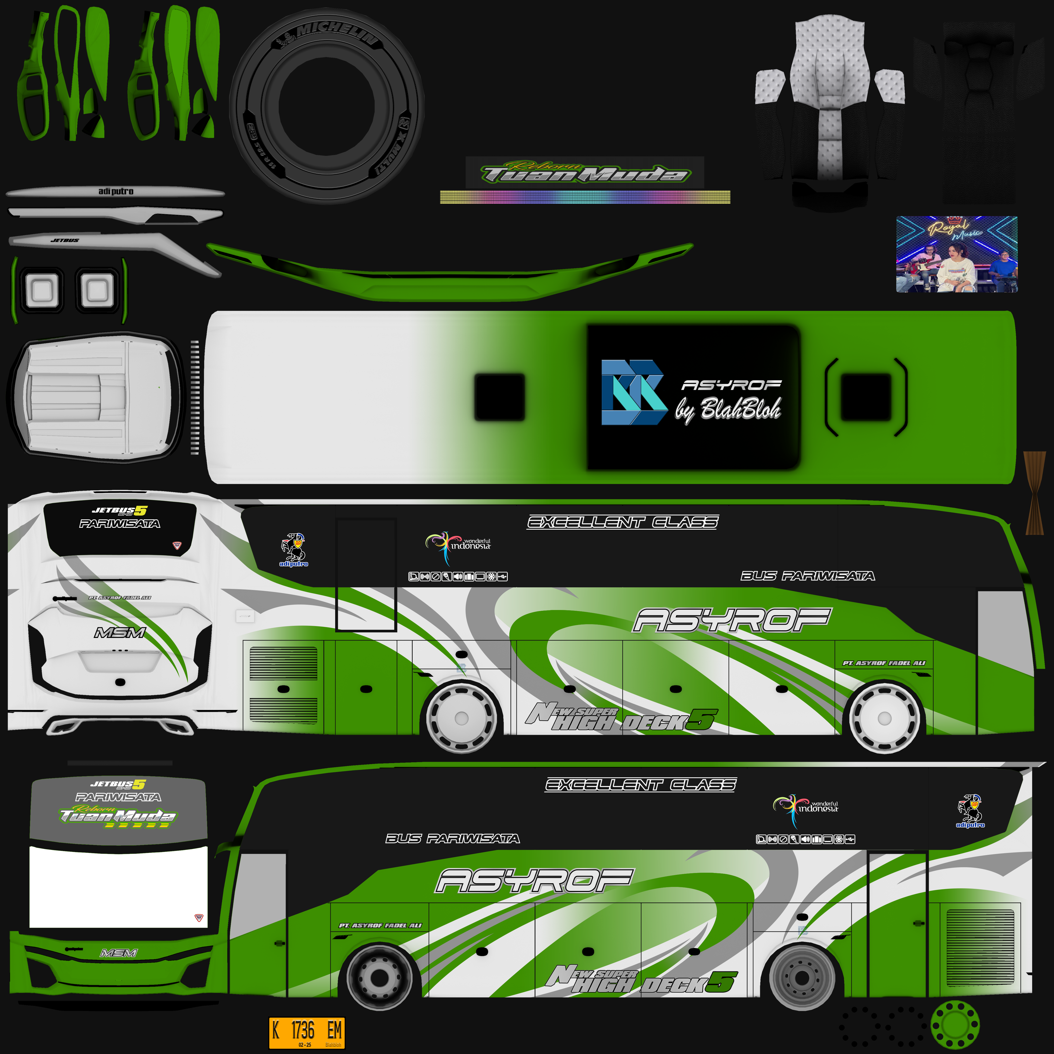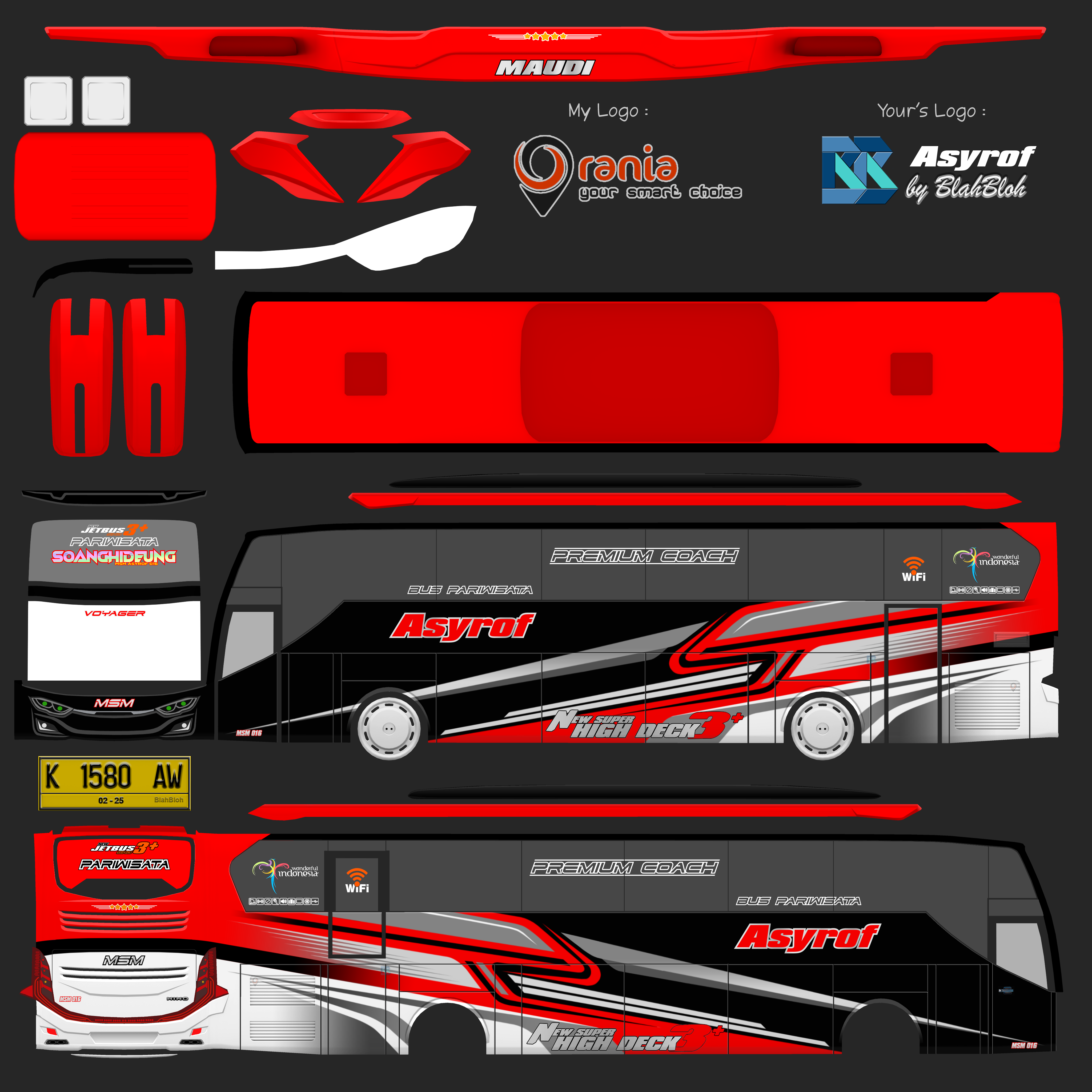 Livery ini memberikan tampilan yang mewah dan menarik, dengan grafis yang tajam dan kombinasi warna yang menonjol. Bus dengan livery Asyrof menjadi lebih estetis dan mencerminkan identitas bus pariwisata yang elegan.