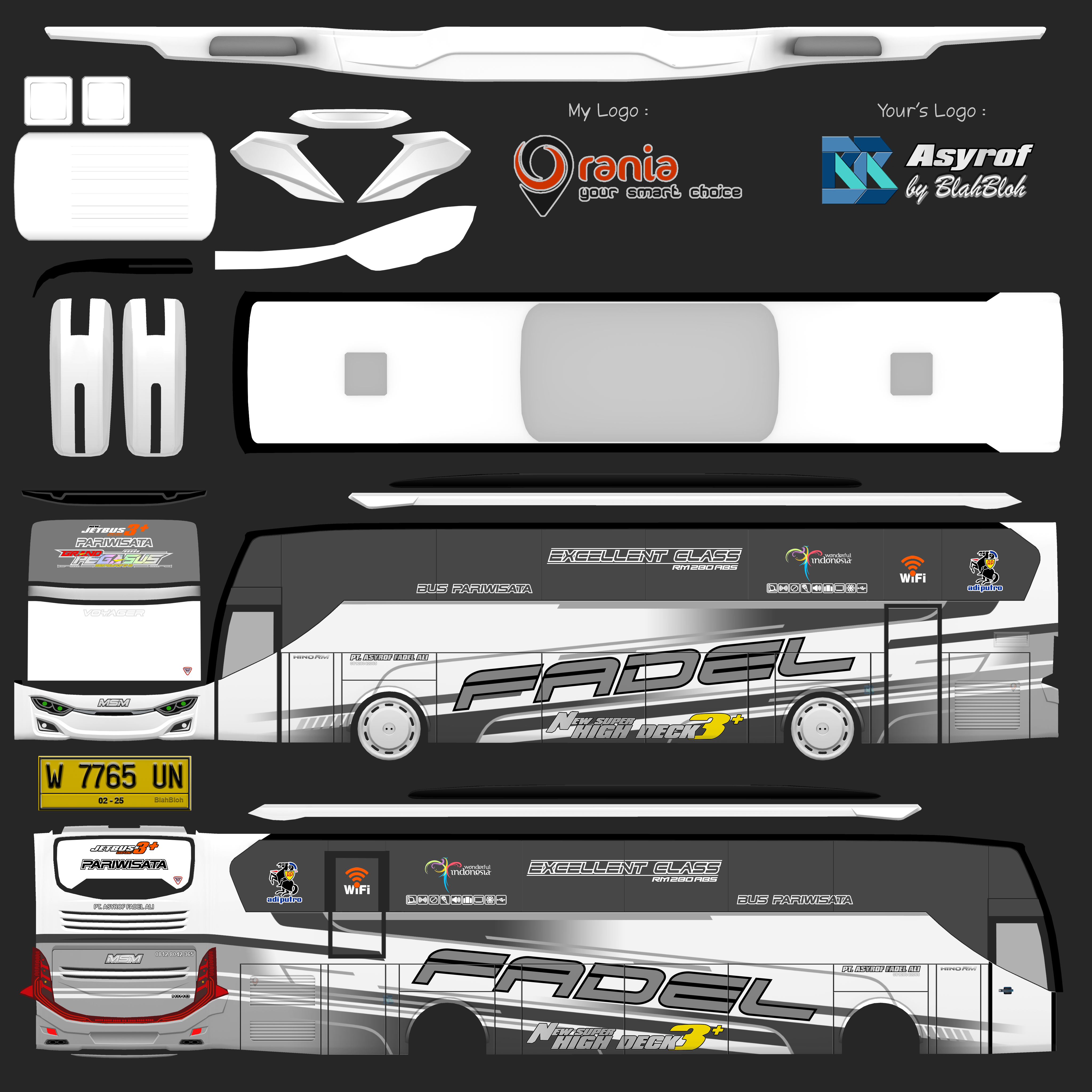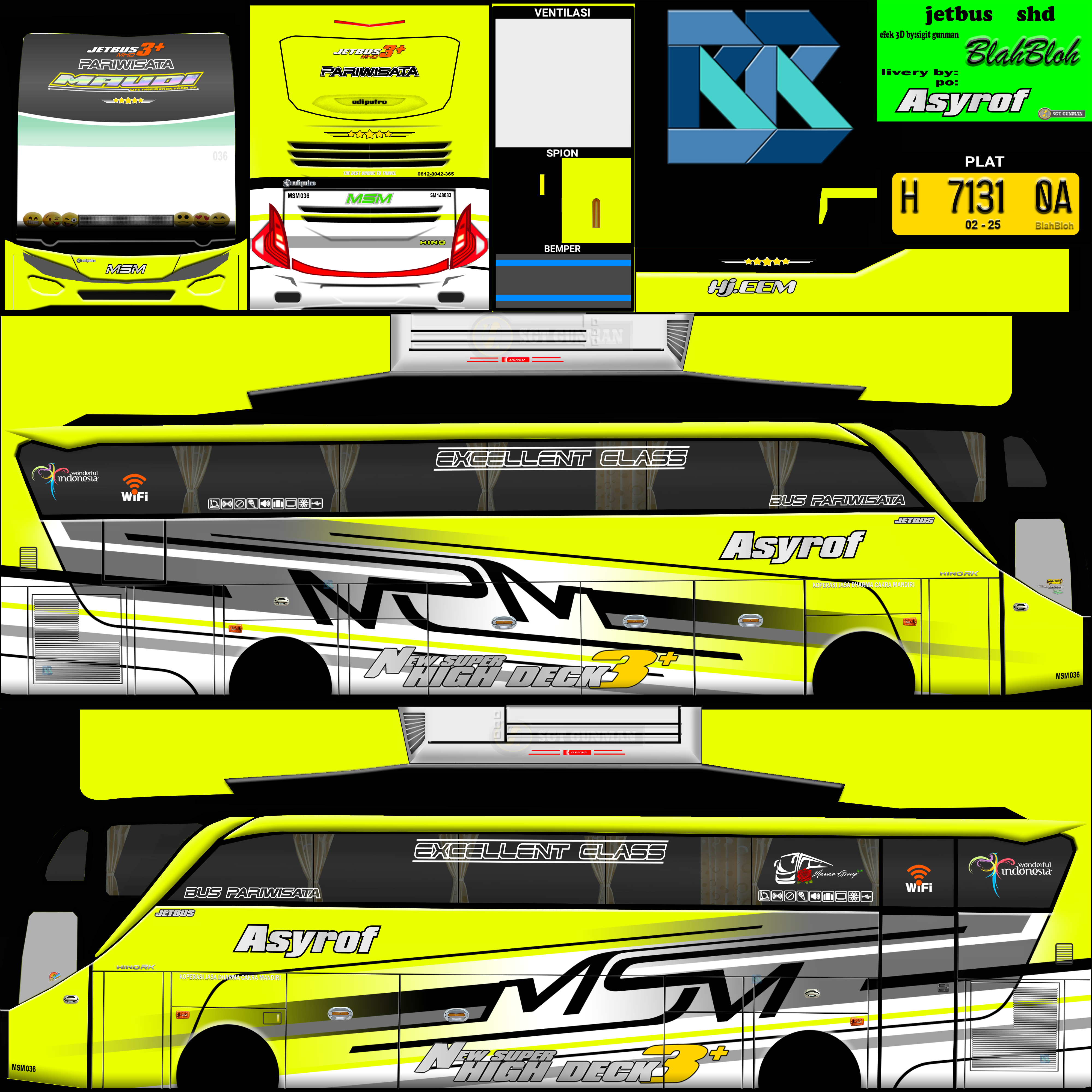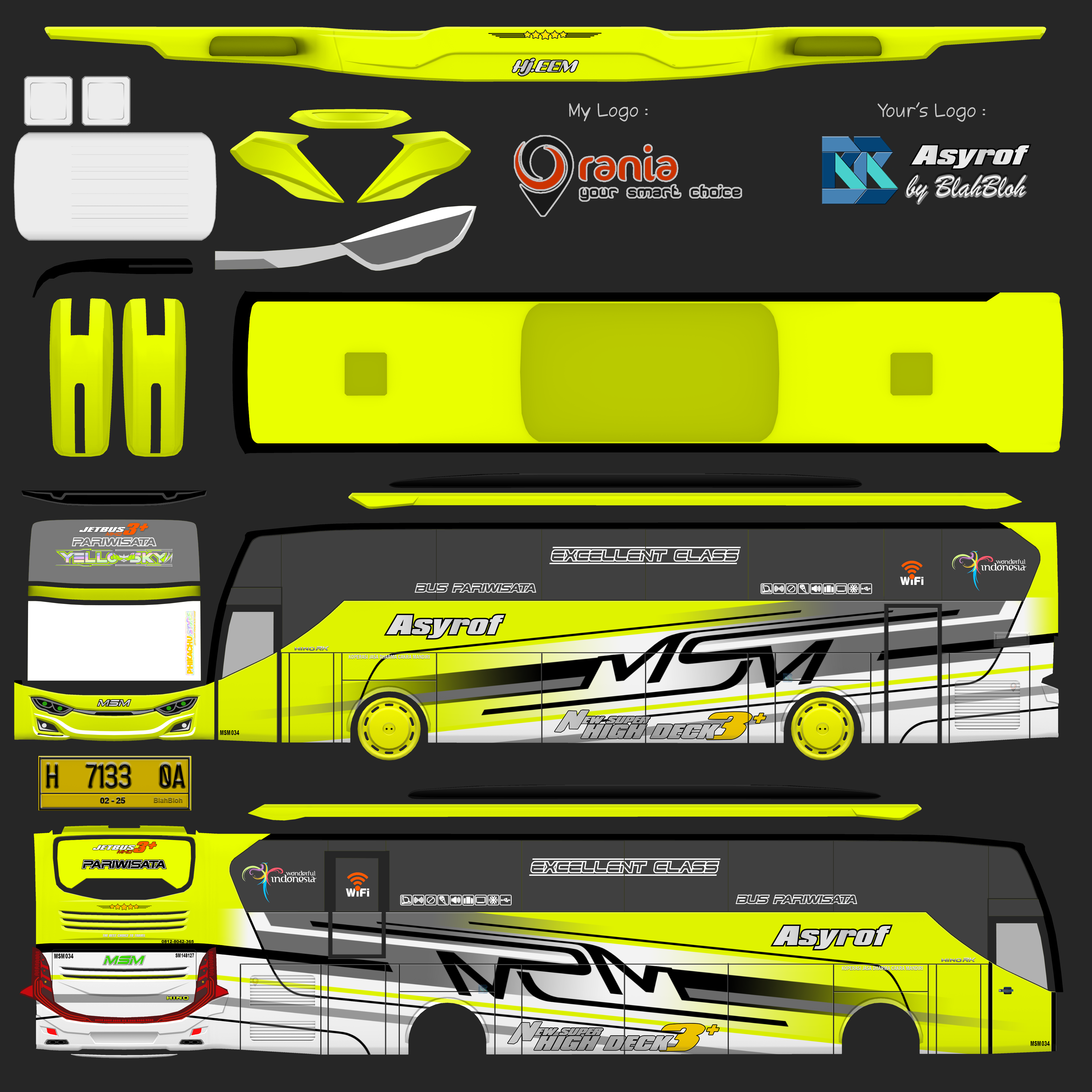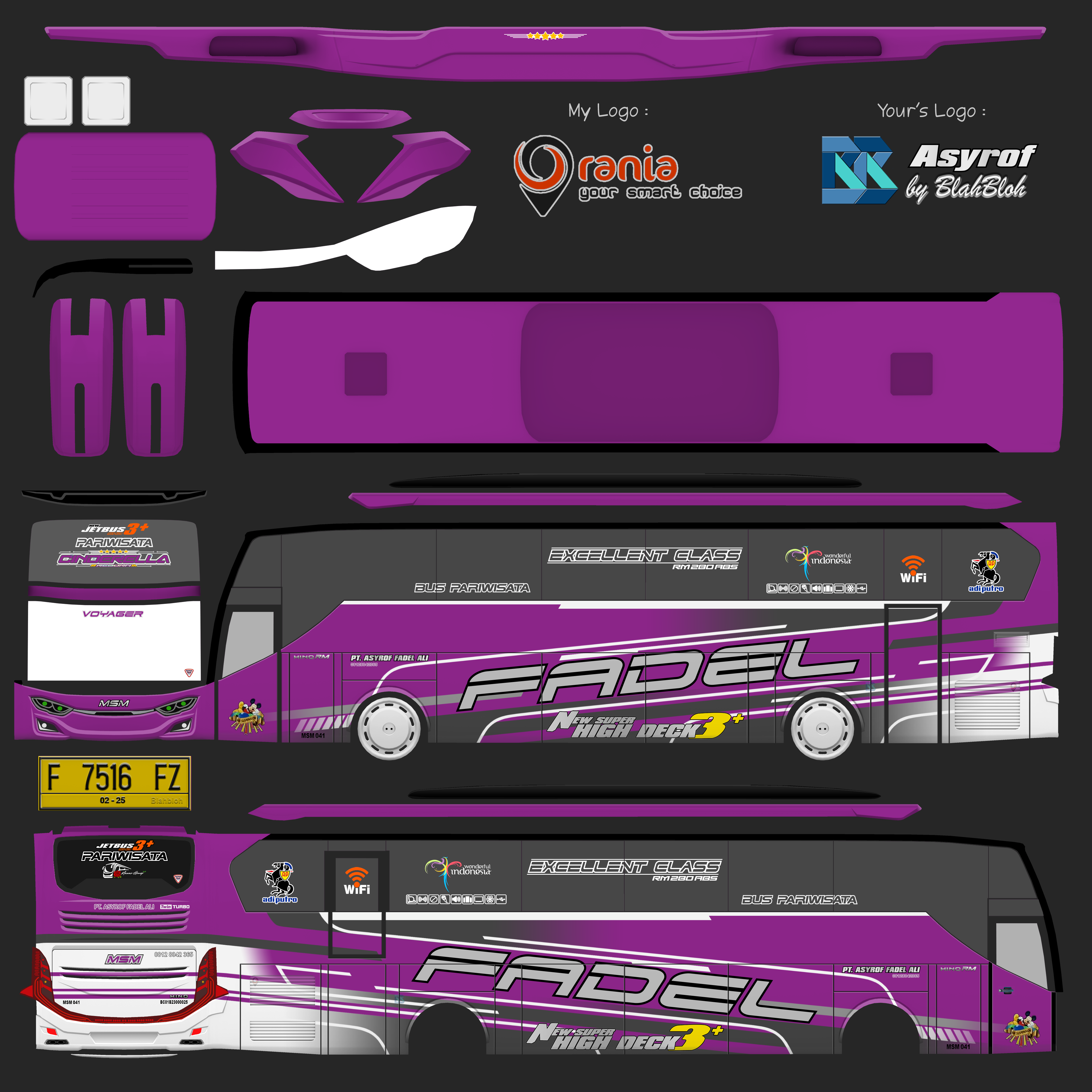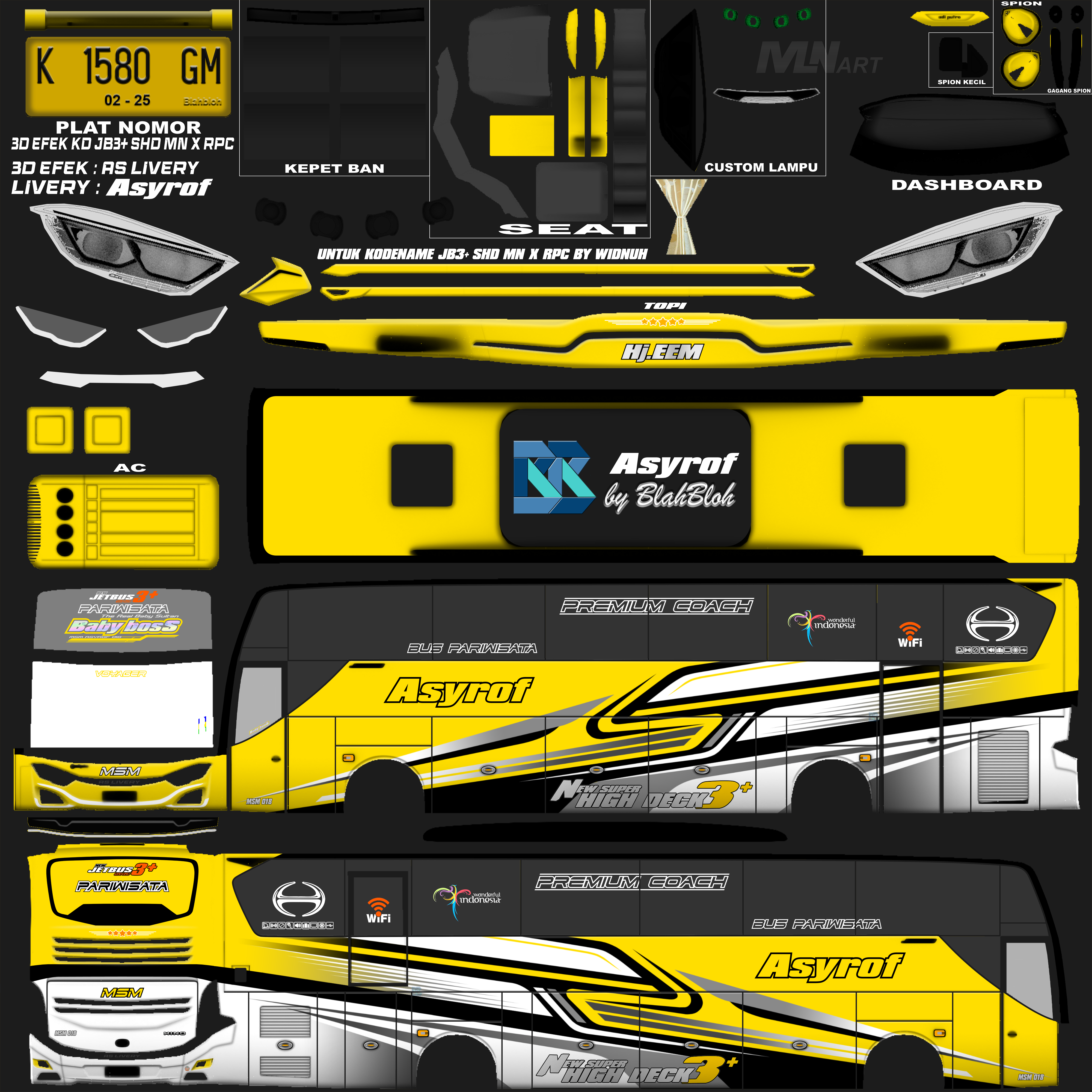 Livery ini memberikan tampilan yang mewah dan menarik, dengan grafis yang tajam dan kombinasi warna yang menonjol. Bus dengan livery Asyrof menjadi lebih estetis dan mencerminkan identitas bus pariwisata yang elegan.