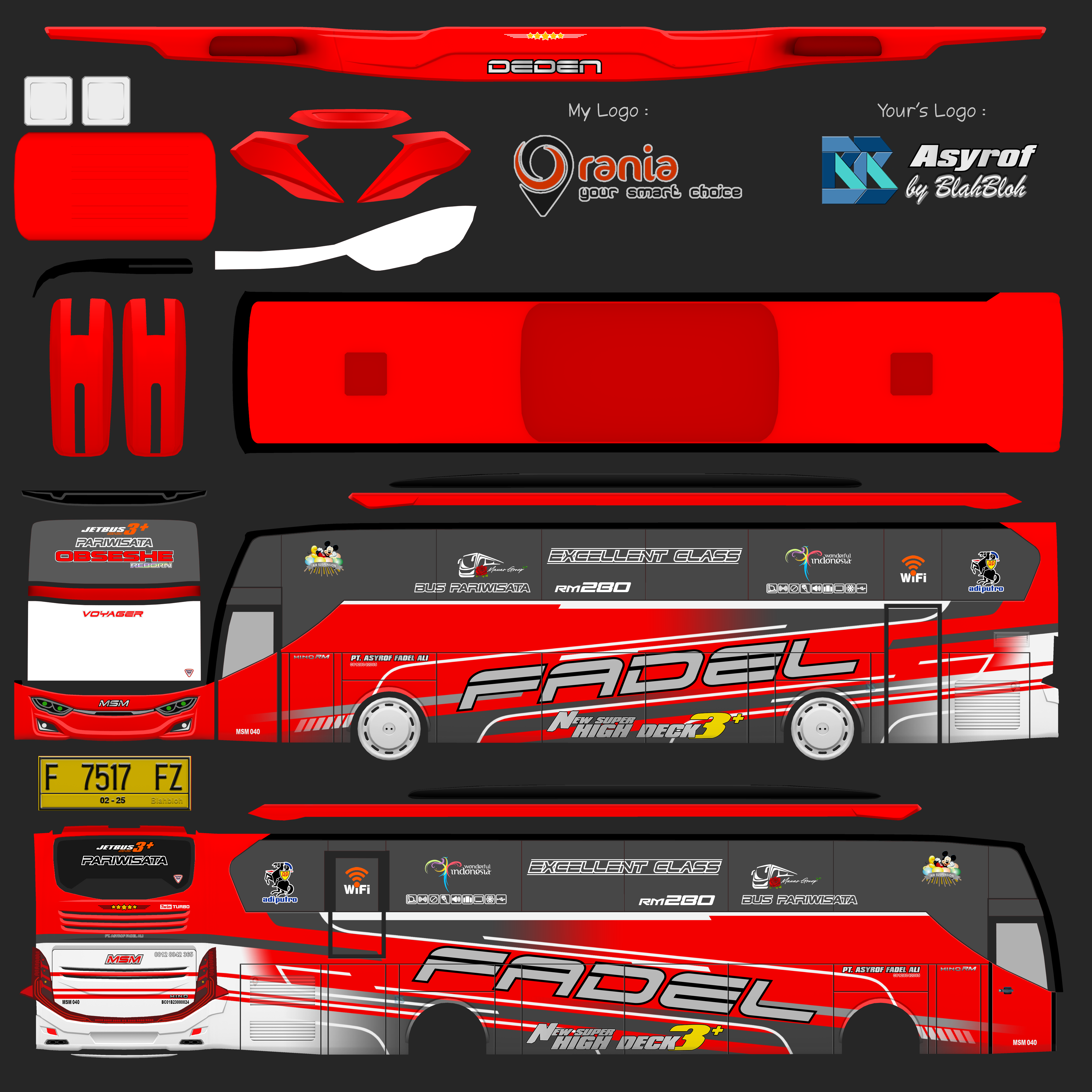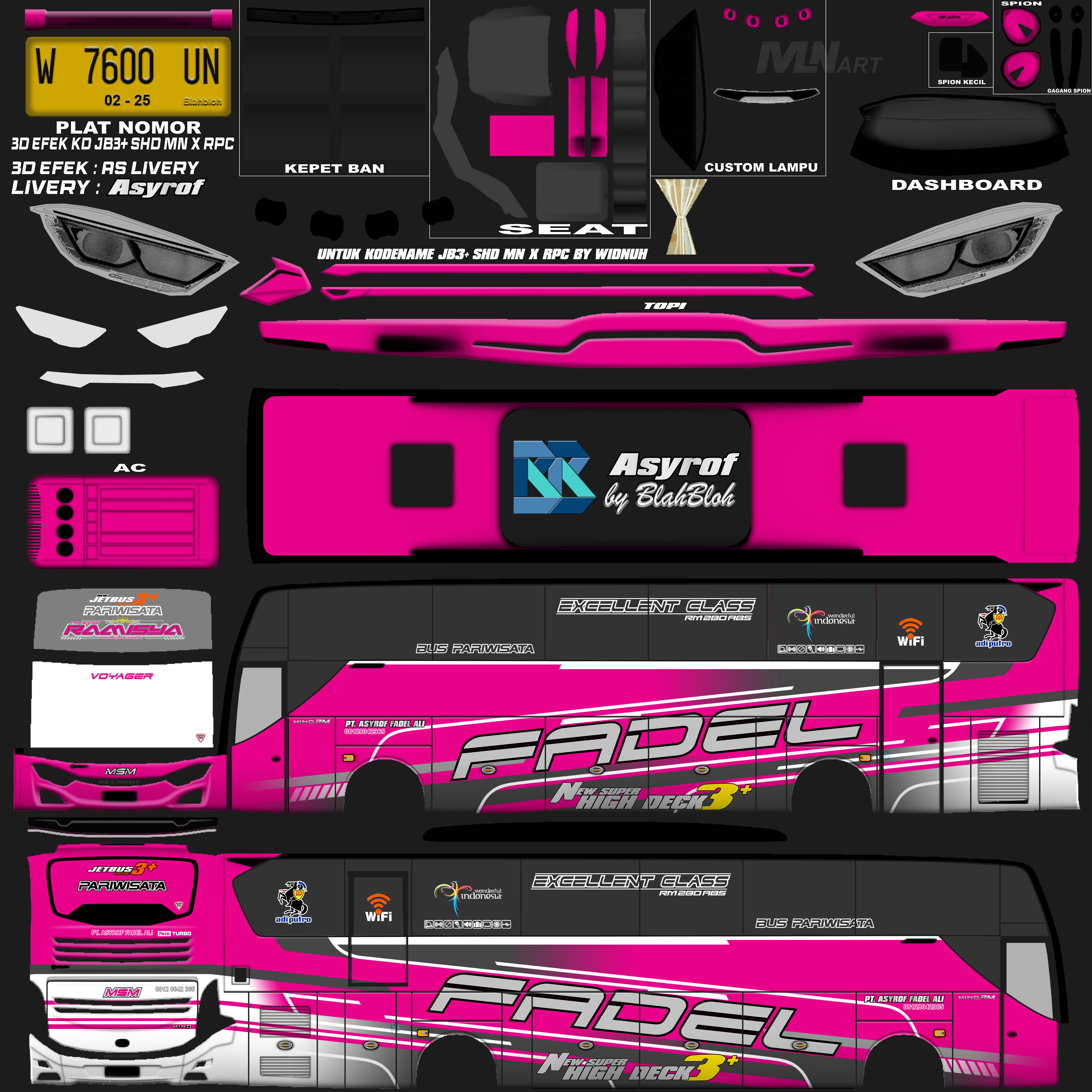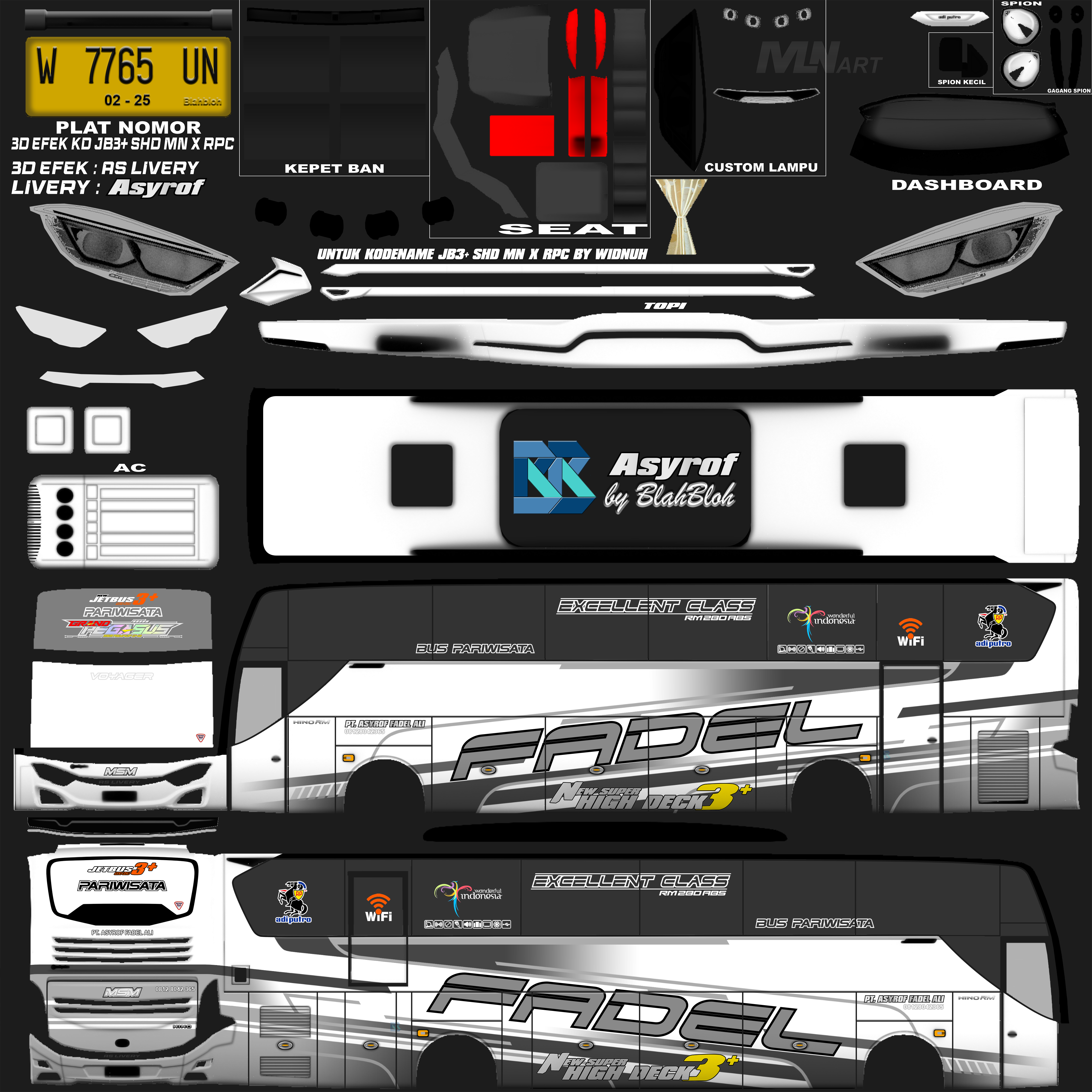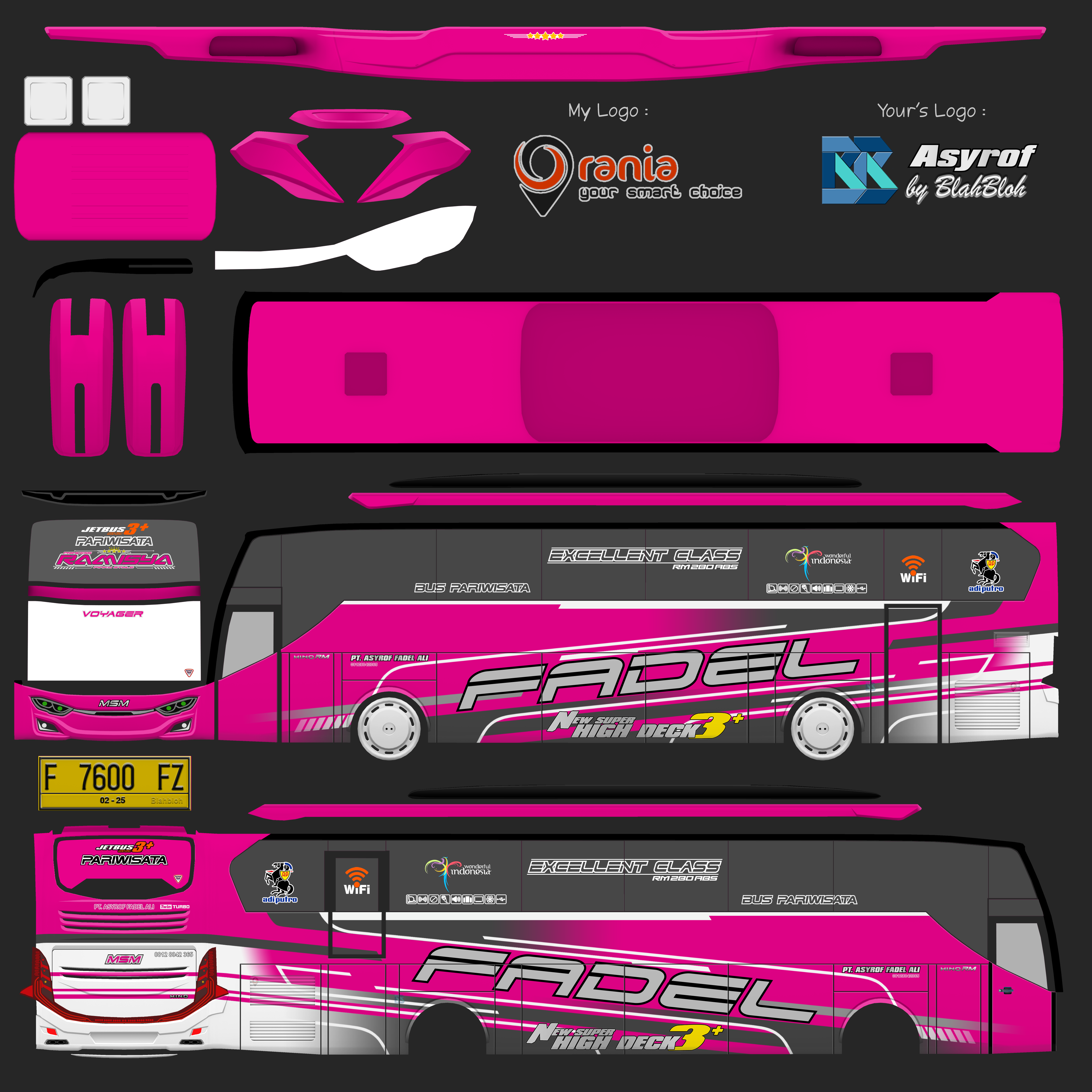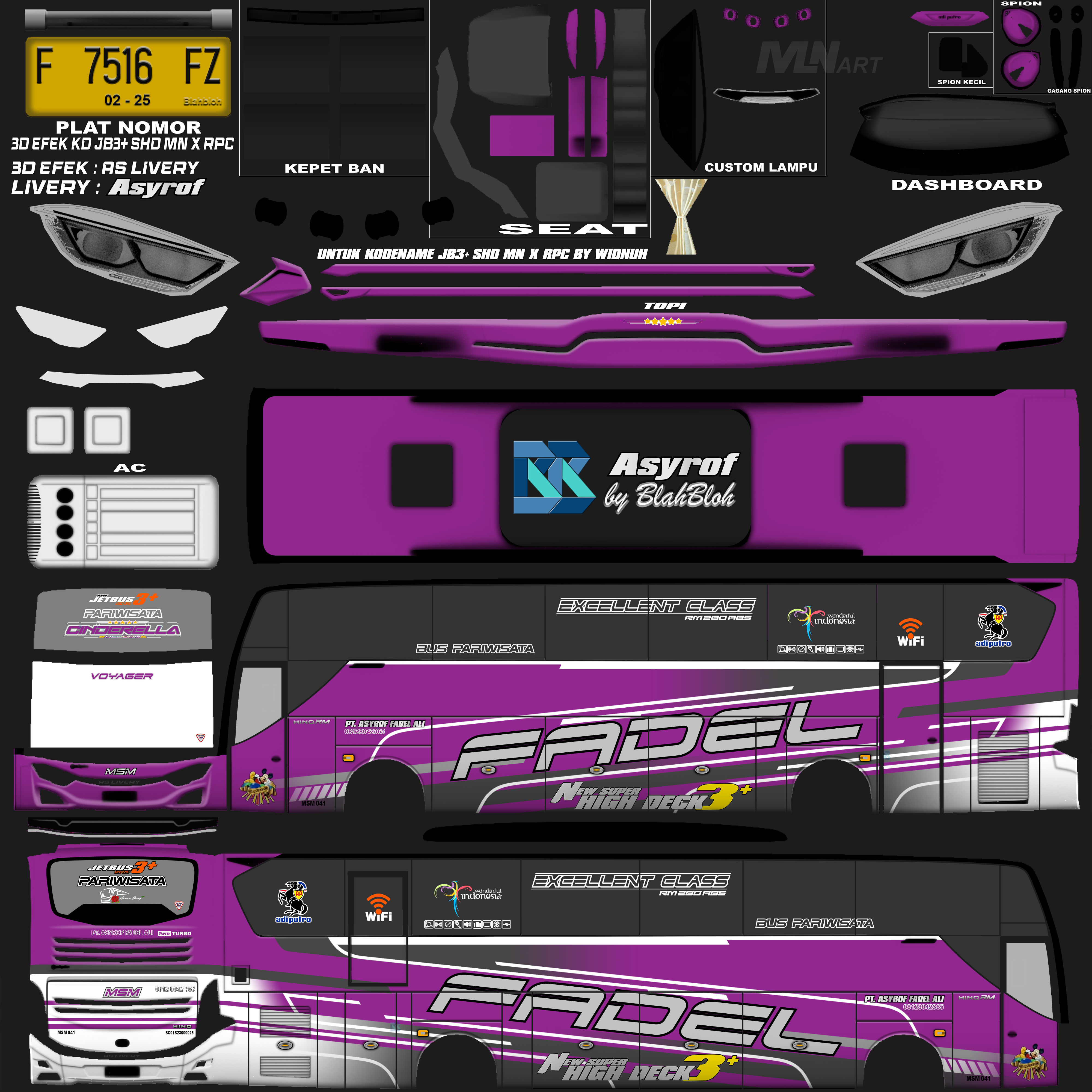 Livery ini memberikan tampilan yang mewah dan menarik, dengan grafis yang tajam dan kombinasi warna yang menonjol. Bus dengan livery Asyrof menjadi lebih estetis dan mencerminkan identitas bus pariwisata yang elegan.