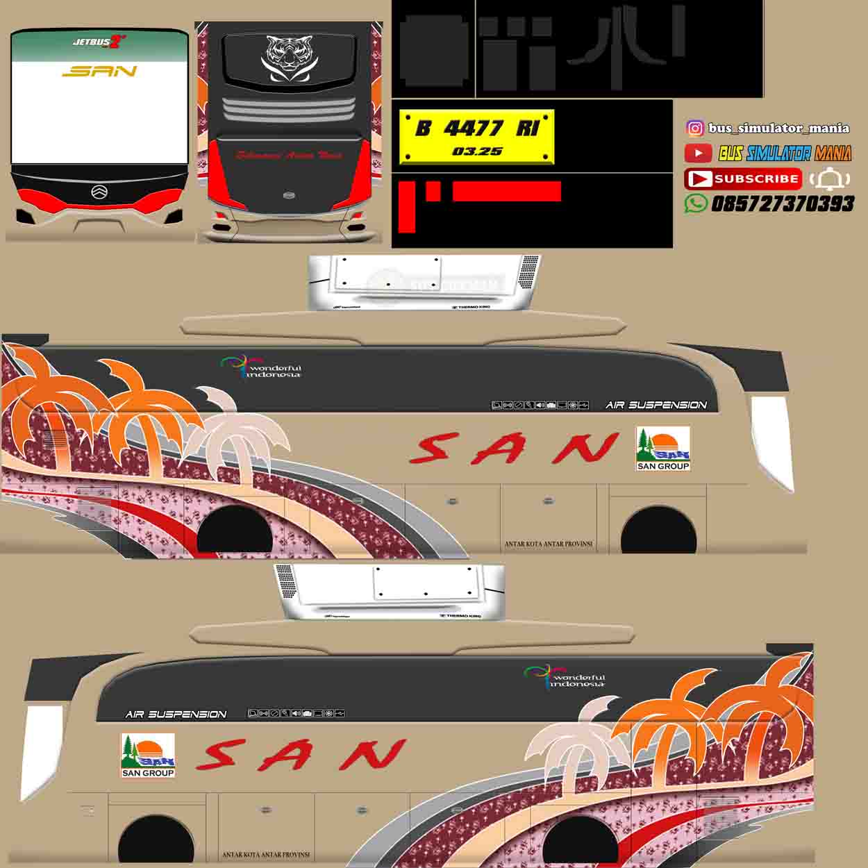 Livery SAN tersedia untuk berbagai tipe bus seperti JB2, JB3, SHD, XHD, dan UHD, dengan resolusi Full HD (.PNG) agar tampil halus tanpa pecah saat digunakan di dalam game.